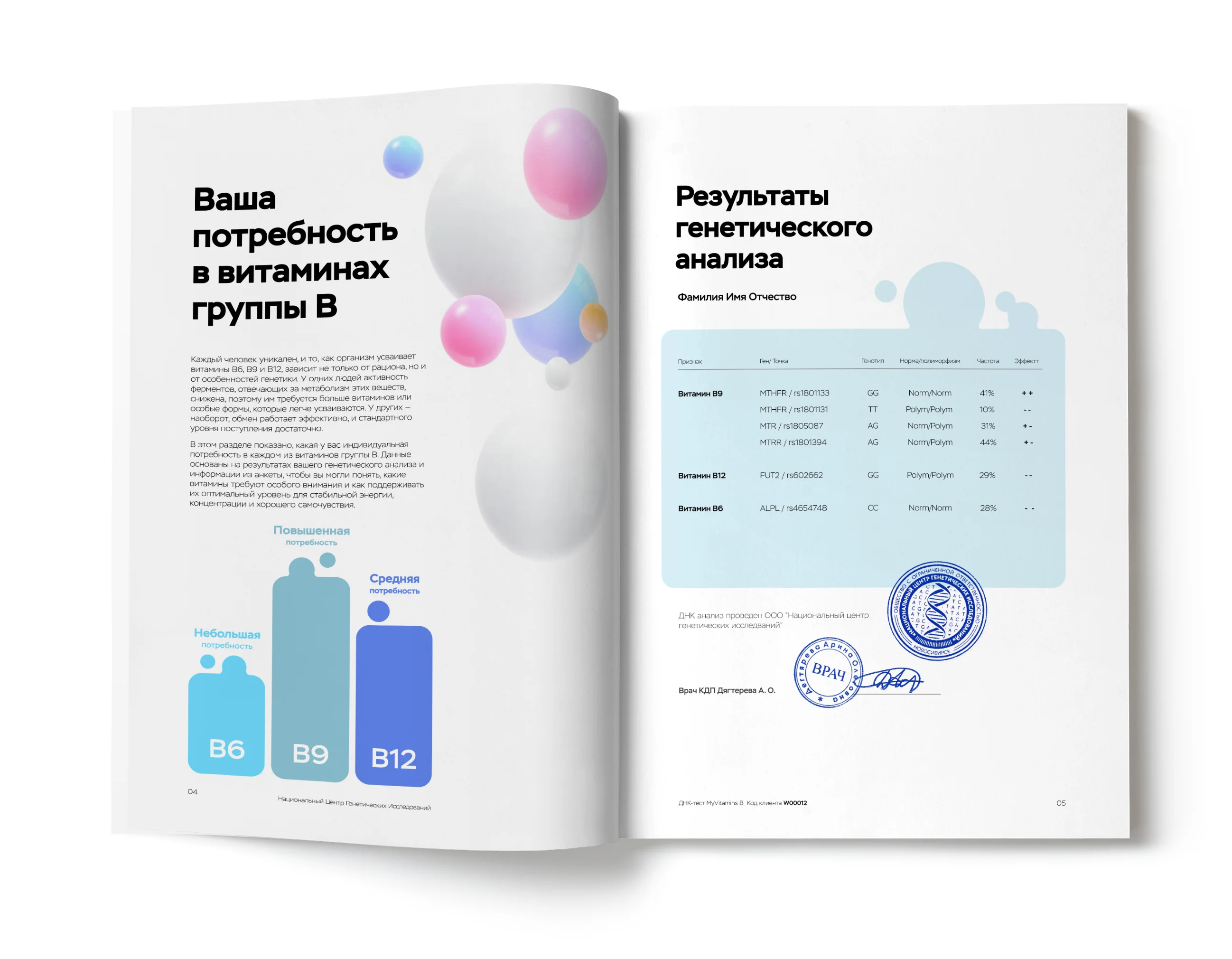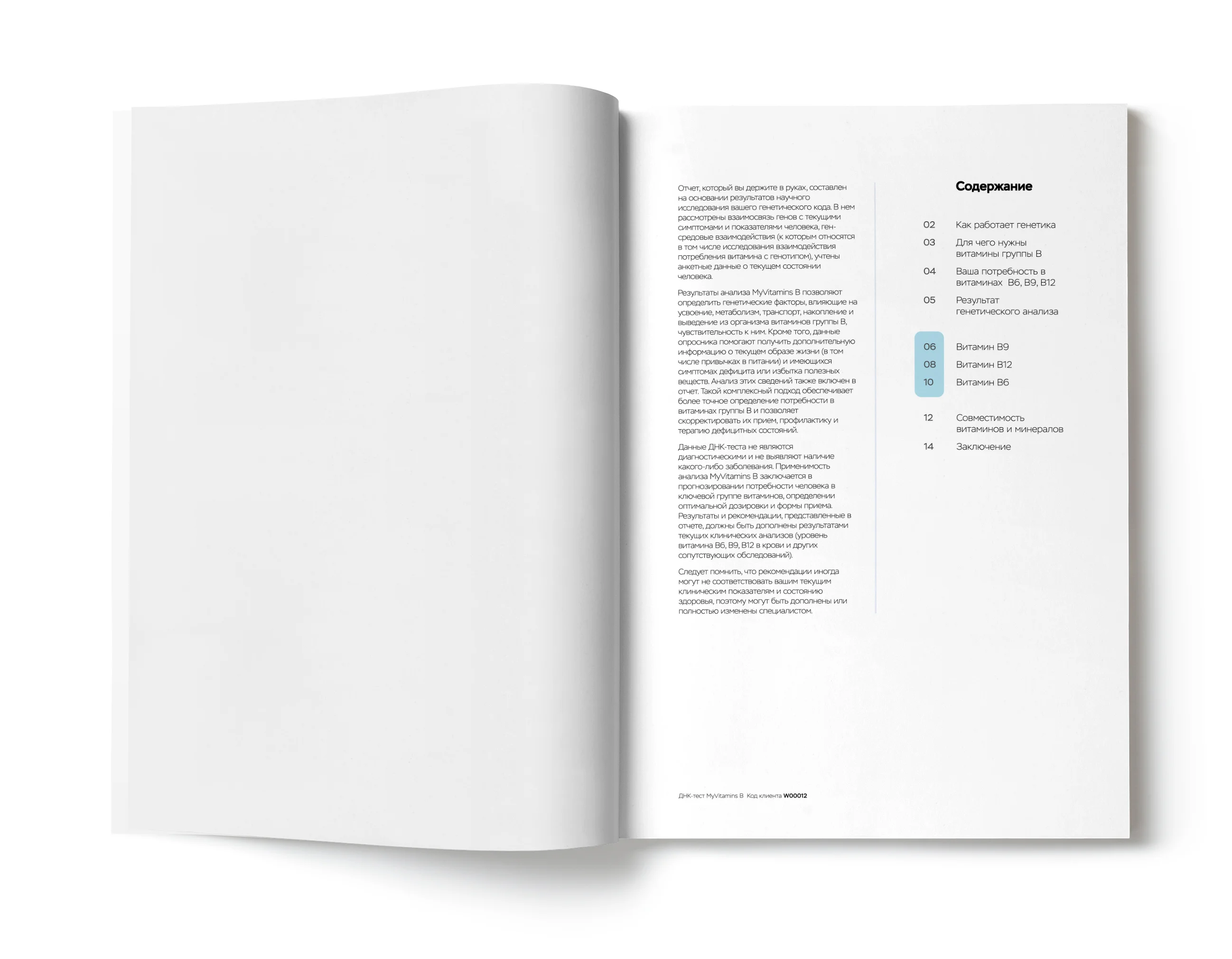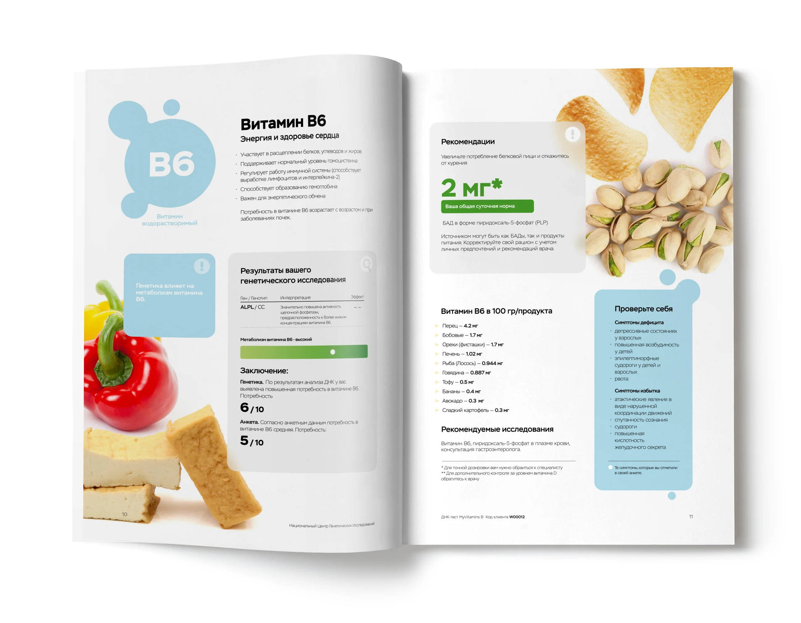 В отчете MyVitamins B анализируются гены, влияющие на метаболизм и усвоение витаминов B6, B9 и B12 — веществ, отвечающих за выработку энергии, здоровье нервной системы и регенерацию клеток. Вы узнаете, какие из них требуют повышенного внимания, получите персональные рекомендации по рациону и добавкам и сможете поддерживать устойчивую энергию и внутренний баланс каждый день.