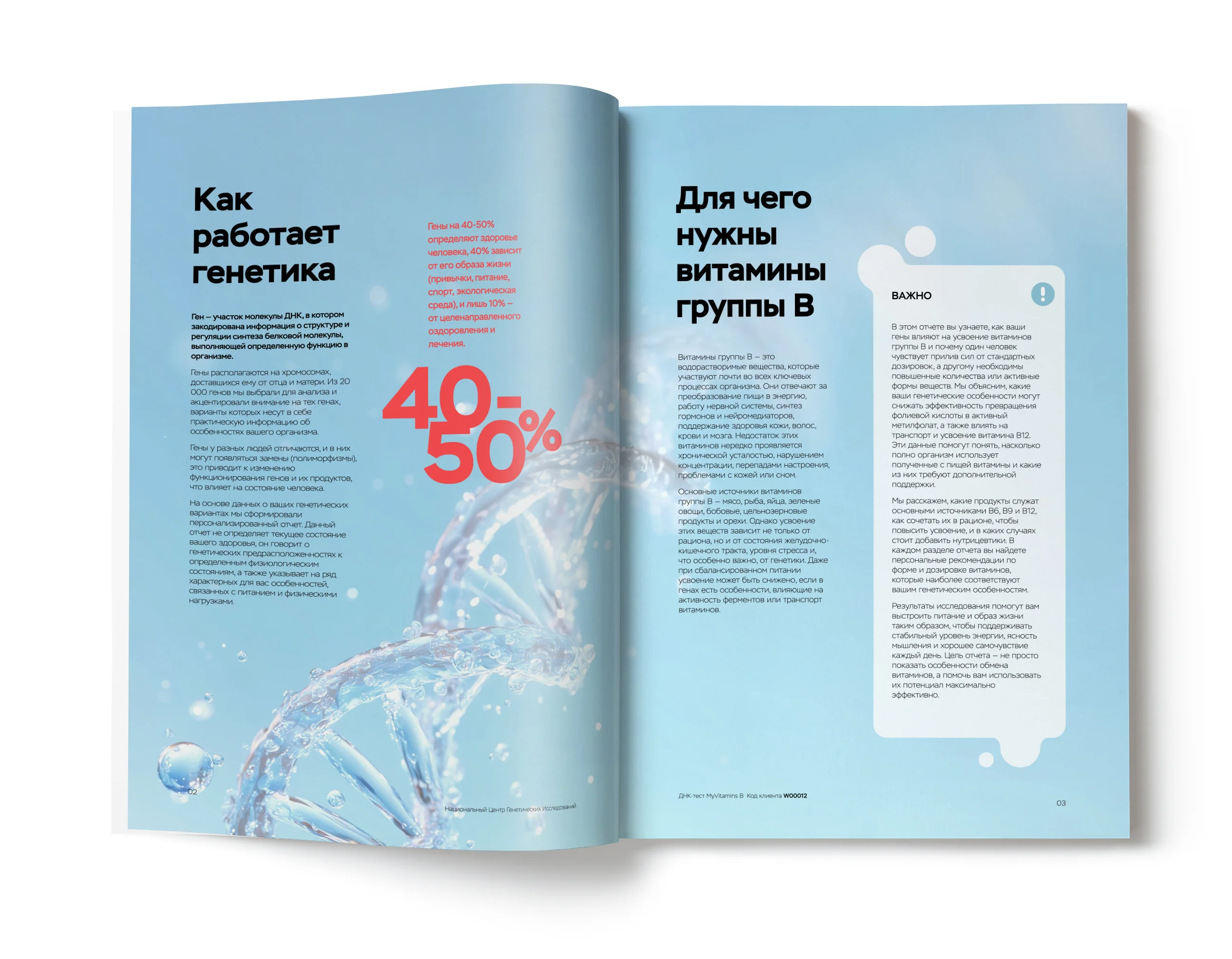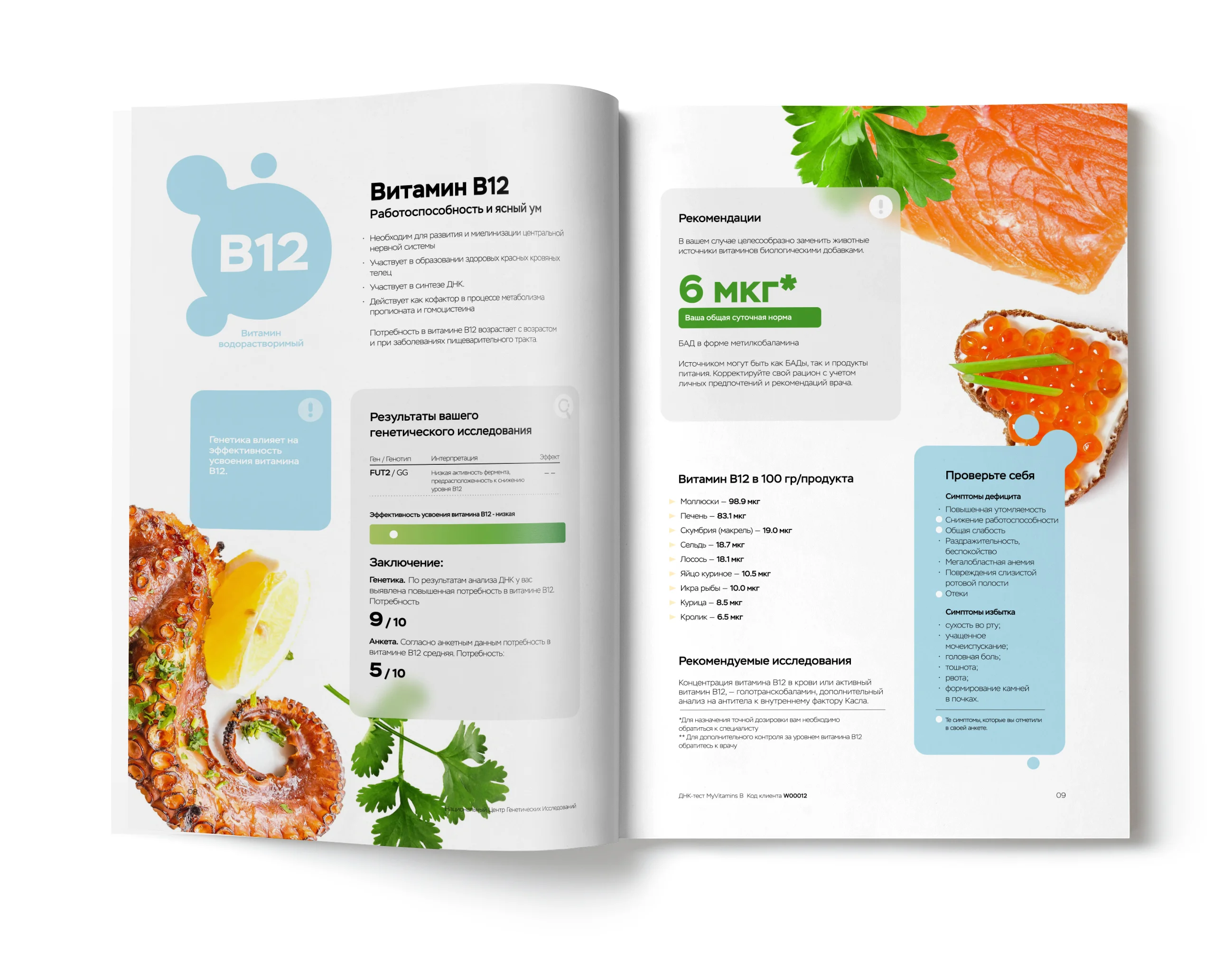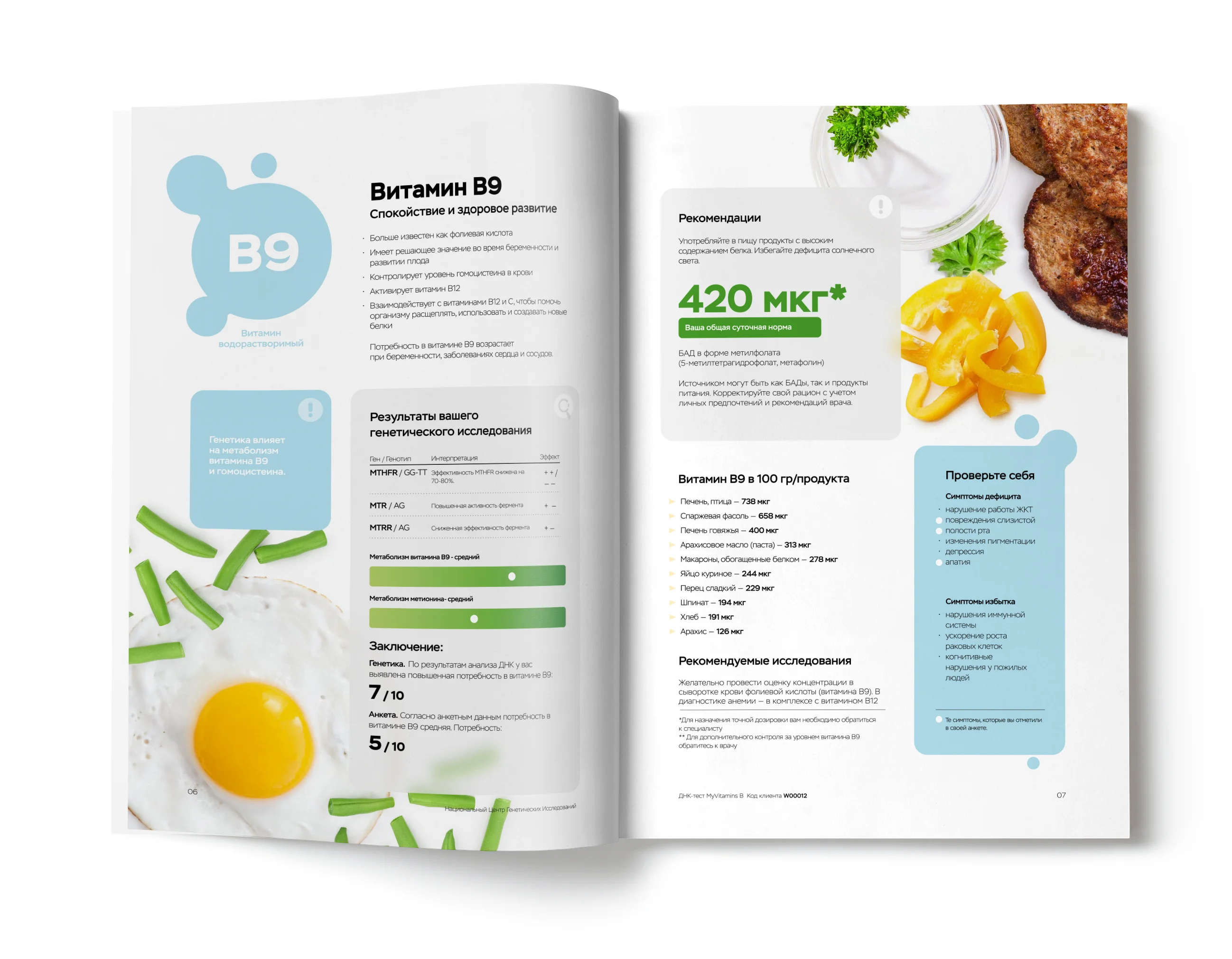 В отчете MyVitamins B анализируются гены, влияющие на метаболизм и усвоение витаминов B6, B9 и B12 — веществ, отвечающих за выработку энергии, здоровье нервной системы и регенерацию клеток. Вы узнаете, какие из них требуют повышенного внимания, получите персональные рекомендации по рациону и добавкам и сможете поддерживать устойчивую энергию и внутренний баланс каждый день.